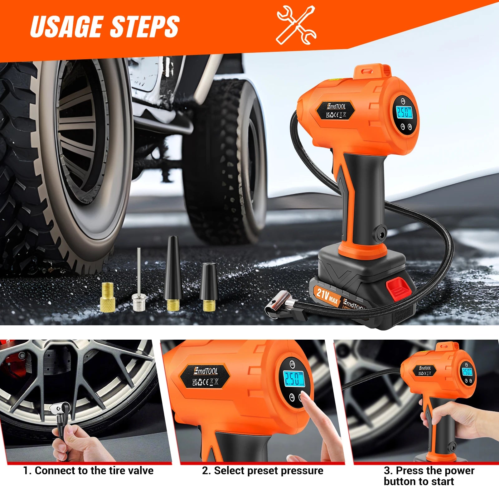 - Complete kit: Includes pump, battery, multiple nozzles, high-pressure hose, cigarette lighter cord, adapter, and manual; suitable for cars, motorcycles, bicycles, mid-size SUVs, and sports balls (not for large trucks).